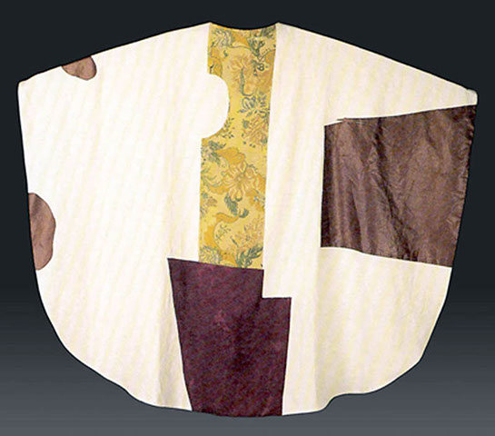 Casel, 1992, 140 x 160 cm, Rückseite aus weißem, alten Tischleinen mit applizierten Paramentenstoffen in Zweitverwendung. Paramentenhaus Wefers, Köln (Pia Steinbrecher) Sankt Peter, Köln.