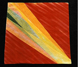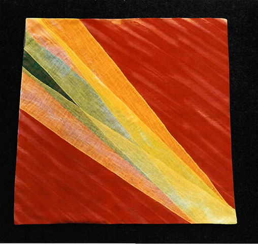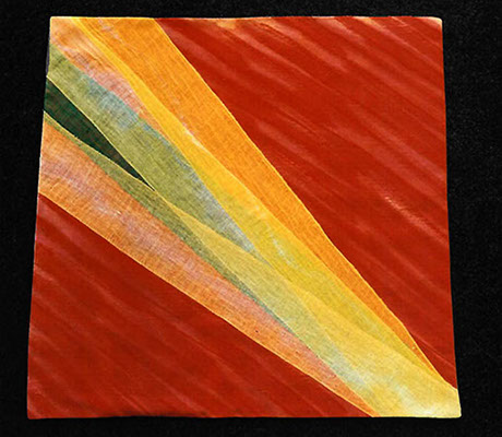 Gefärbte Gaze-Streifen, rot dominiert, auf Rupfen-Wollgewebe.