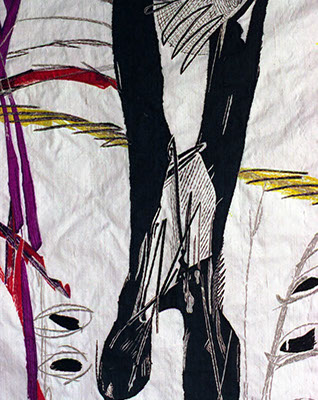 Stickerei und teils überstickte Applikationen auf Doupionseide, nach 1:1 Vorlage in Farbzeichnung,