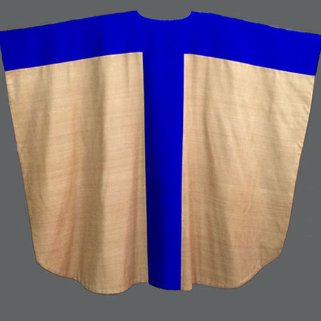 Casel, 2014, Bouretteseide mit appliziertem blauen Taukreuz in Doupion, Paramentenhaus Wefers Köln