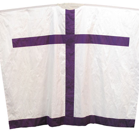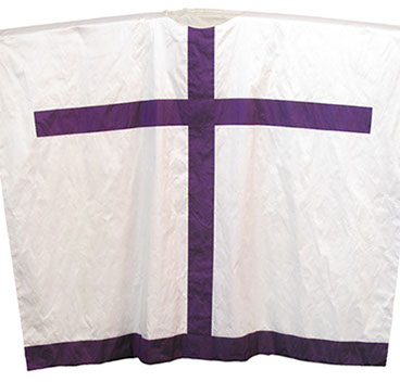 Weiße Casel 2010, 140 x 160 cm, Vorderseite, Doupionseide mit violetten Applikationen in Doupion, Paramentenhaus Wefers Köln