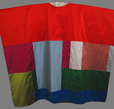 Casel 2012, 140 x 160 cm, Vorderseite, patchwork−artig verbundene und in Farbe und Größe unterschiedliche Felder bei dominierendem Rot, Paramentenhaus Wefers Köln (auf der Rückseite ein nicht zu großer Schriftzug appliziert mit dem Thema des Gewandes: "Lk 17.21" >Denn das Himmelreich ist bereits jetzt auf Erden<, was die paradiesische Vielfalt der Farben erklärt)
