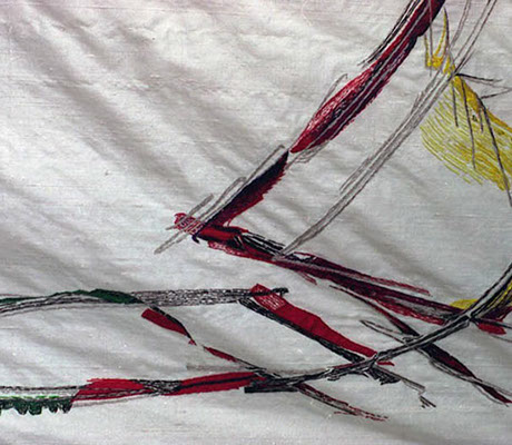 Stickerei und teils überstickte Applikationen auf Doupionseide, nach 1:1 Vorlage in Farbzeichnung,