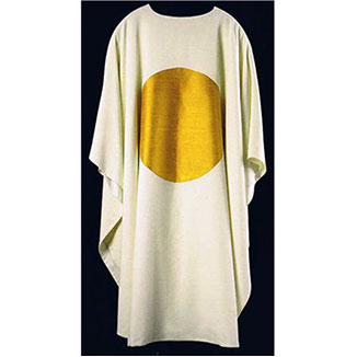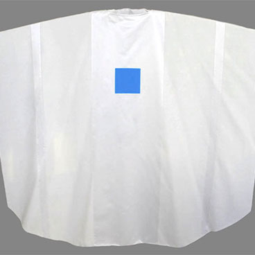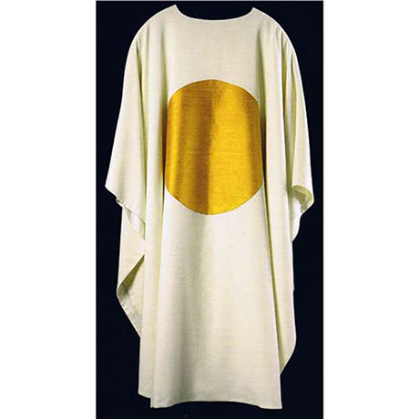 Casel, 2014, Bouretteseide mit appliziertem blauen Taukreuz in Doupion, Paramentenhaus Wefers Köln