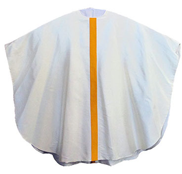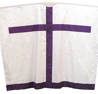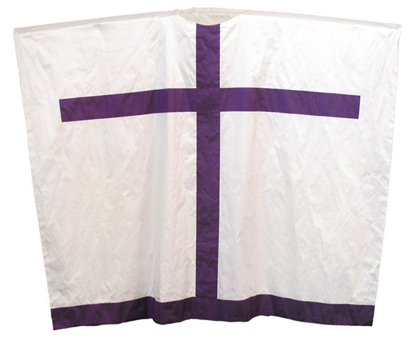 Weiße Casel 2010, 140 x 160 cm, Vorderseite, Doupionseide mit violetten Applikationen in Doupion, Paramentenhaus Wefers Köln