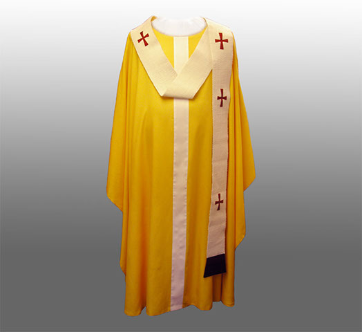 Weltjugendtags−Casel 2005, päpstliches Gewand, Vorderseite, Gelbgoldene Seide mit Applikation, Paramentenhaus Wefers