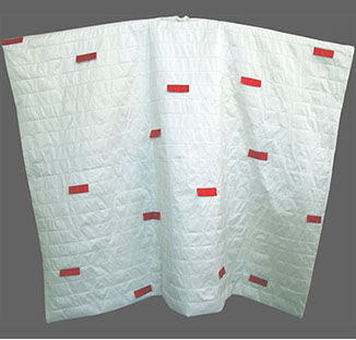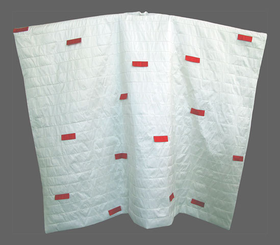 Weiße Casel 2008, 140 x 160 cm, Doupionseide mit strukturierenden horizontalen Steppnähten sowie nur einseitig befestigten, querrechteckigen roten Feldern, Paramentenhaus Wefers Köln