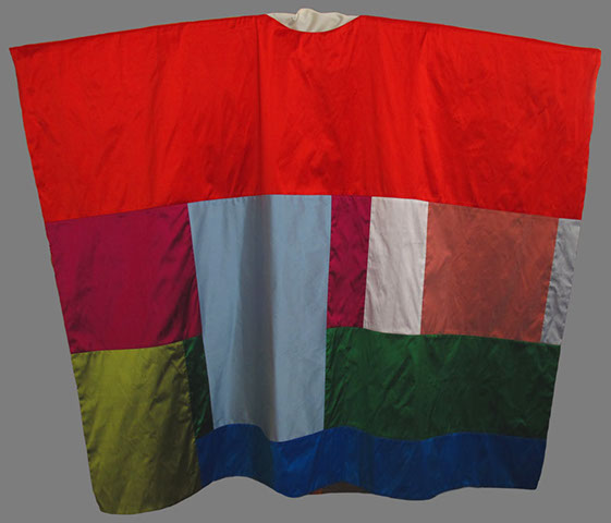 Casel 2012, 140 x 160 cm, Vorderseite, patchwork−artig verbundene und in Farbe und Größe unterschiedliche Felder bei dominierendem Rot, Paramentenhaus Wefers Köln (auf der Rückseite ein nicht zu großer Schriftzug appliziert mit dem Thema des Gewandes: "Lk 17.21" >Denn das Himmelreich ist bereits jetzt auf Erden<, was die paradiesische Vielfalt der Farben erklärt)